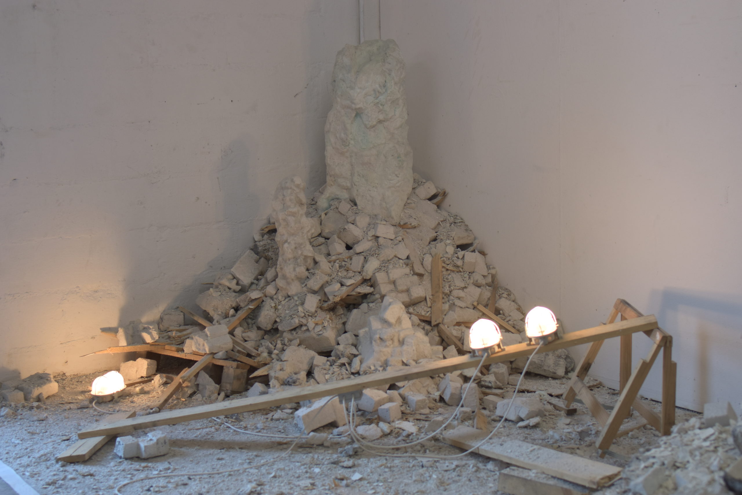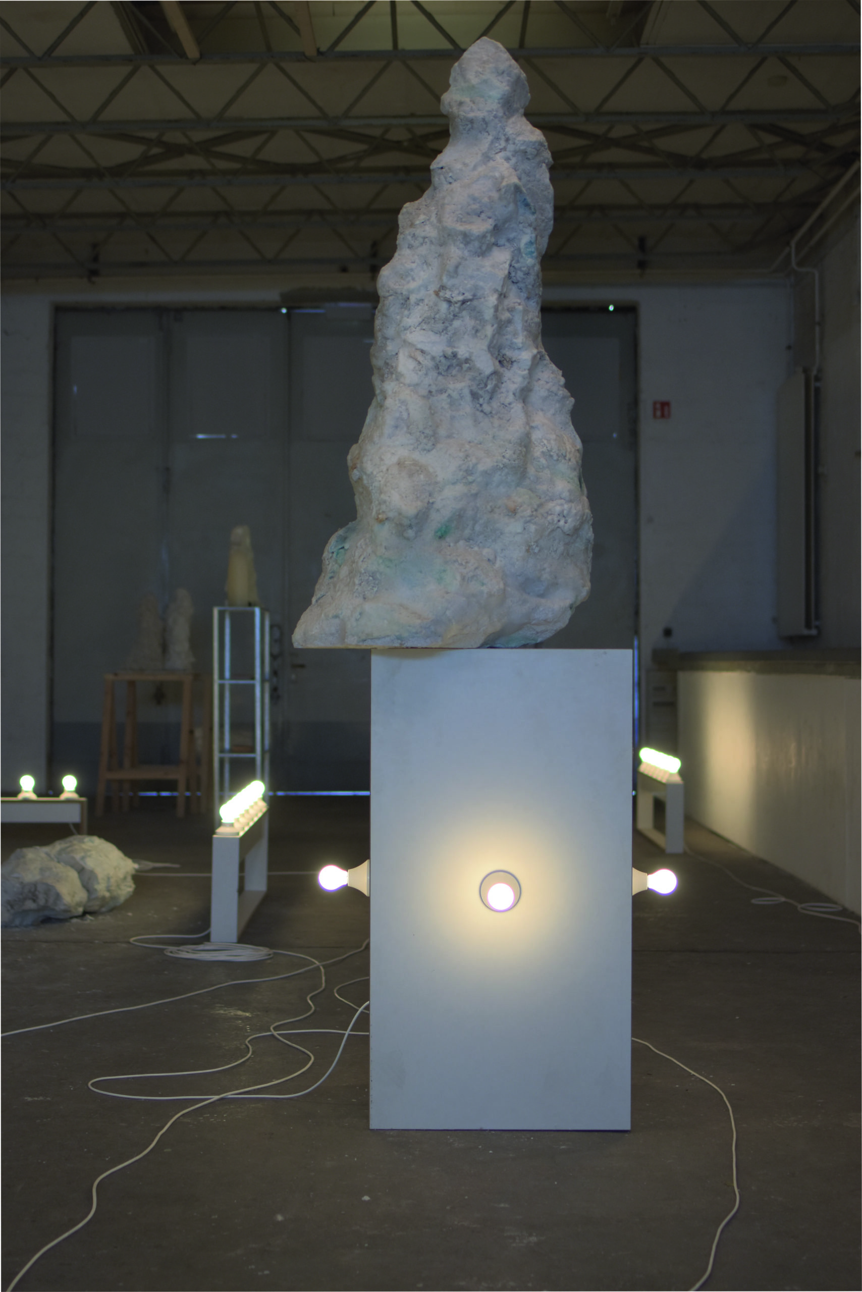 100x80x270 cm, Porenbeton, Wachs, Pigment, Holz, MDF, Kabel, Fassungen, Glühbirnen