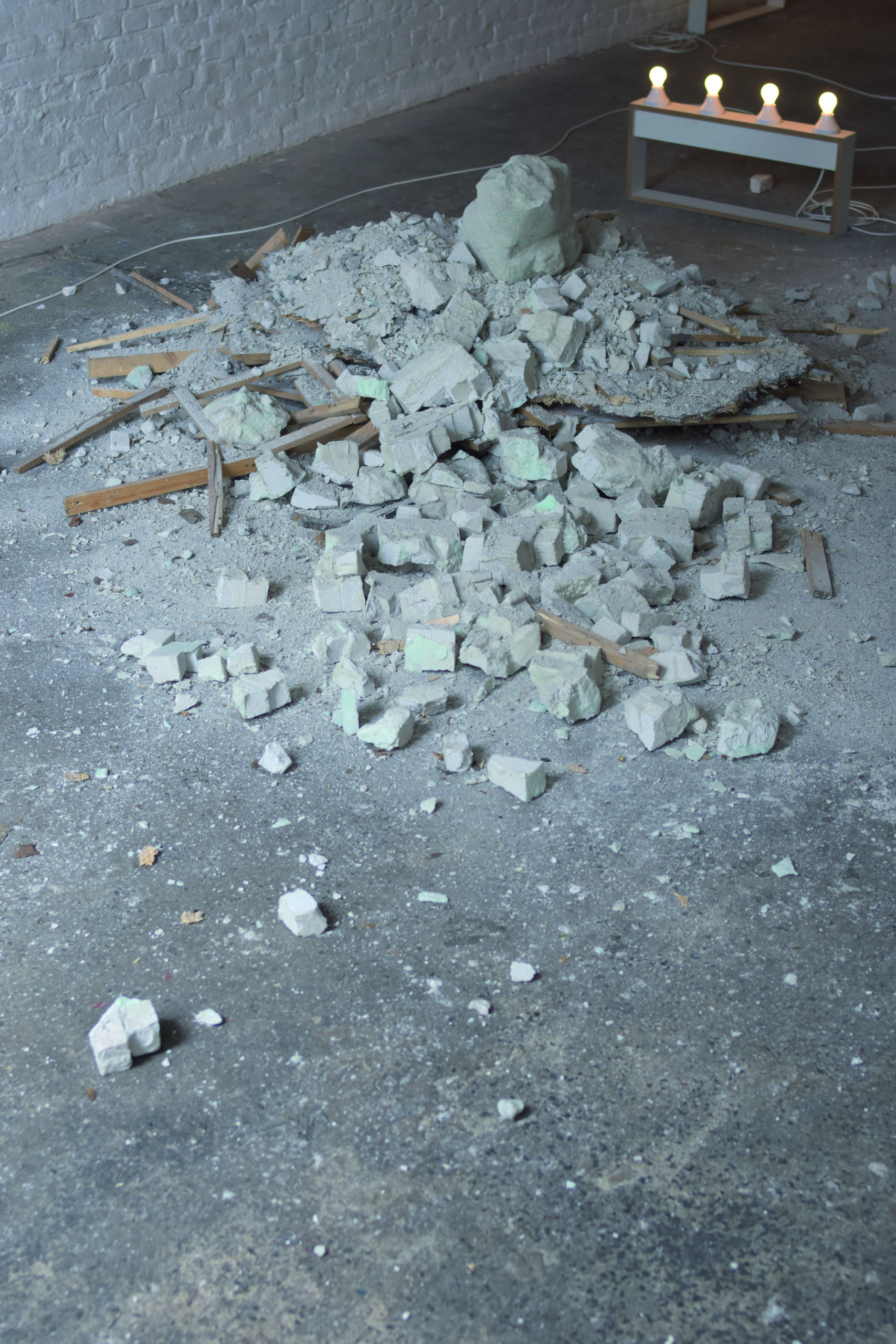 400x400x85 cm, Porenbeton, Wachs, Pigment, Holz, OSB-Platten, MDF, Kabel, Fassungen, Glühbirnen